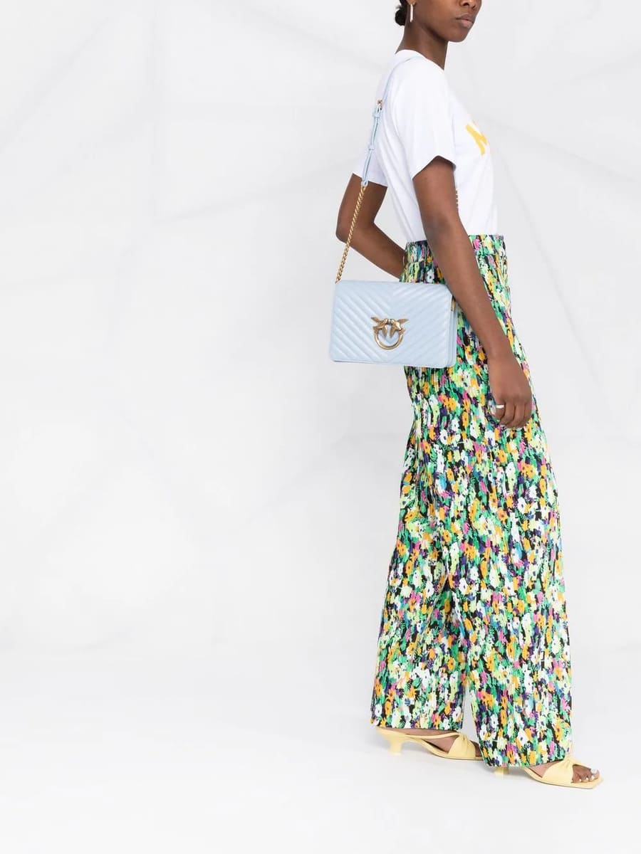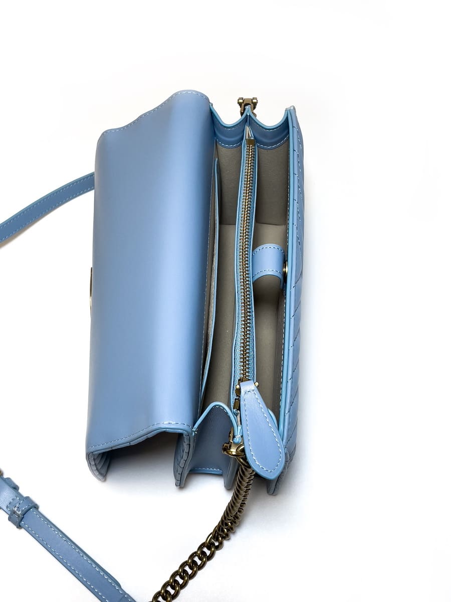 Сумка Classic Love Bag Click из стеганой кожи наппа с шевронным узором. Потайная магнитная застежка дополнена легендарной пряжкой Love Birds Diamond Cut из металла с гравировкой. Внутреннее отделение на подкладке из микрофибры дополнено карманом-перегородкой на молнии и плоским карманом из кожи. Плечевой ремень длиной 110 см представляет собой комбинацию металлической цепочки с квадратными звеньями и практичного регулируемого наплечника из кожи наппа.
