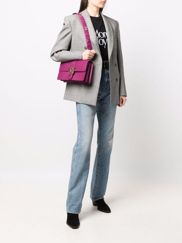 Сумка Classic Love Bag Icon из мягкой шелковистой кожи. Застежка с кожаным ремешком и заклепками дополнена легендарной пряжкой Love Birds Diamond Cut из металла с гальваническим покрытием цвета античного золота. Внутреннее отделение на подкладке из микрофибры включает карман-перегородку на молнии и плоский карман из кожи. Плечевой ремень из кожи украшен ювелирными буквами, образующими фразу PINKO TI AMO.