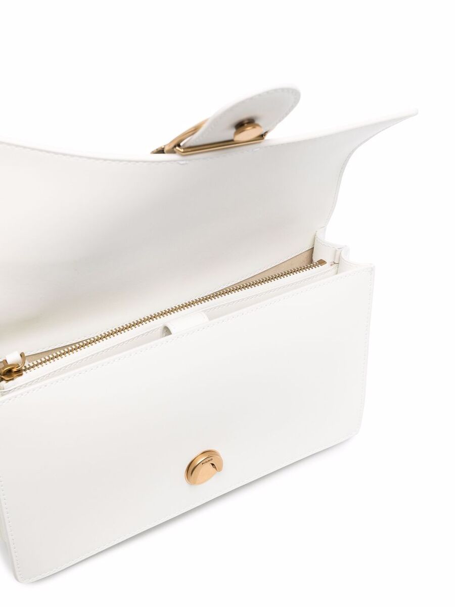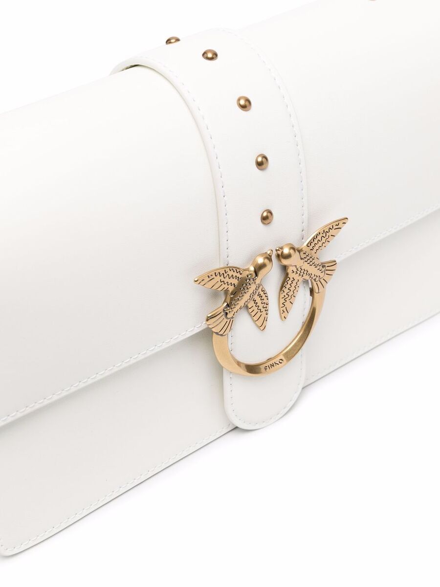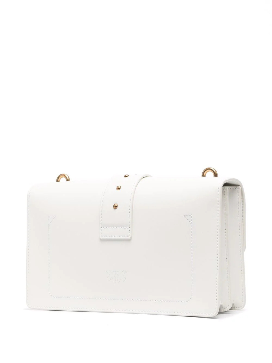 Сумка Classic Love Bag Icon из мягкой шелковистой кожи. Застежка с кожаным ремешком и заклепками дополнена легендарной пряжкой Love Birds Diamond Cut из металла с гальваническим покрытием цвета античного золота. Внутреннее отделение на подкладке из микрофибры включает карман-перегородку на молнии и плоский карман из кожи. Плечевой ремень из кожи украшен ювелирными буквами, образующими фразу PINKO TI AMO.