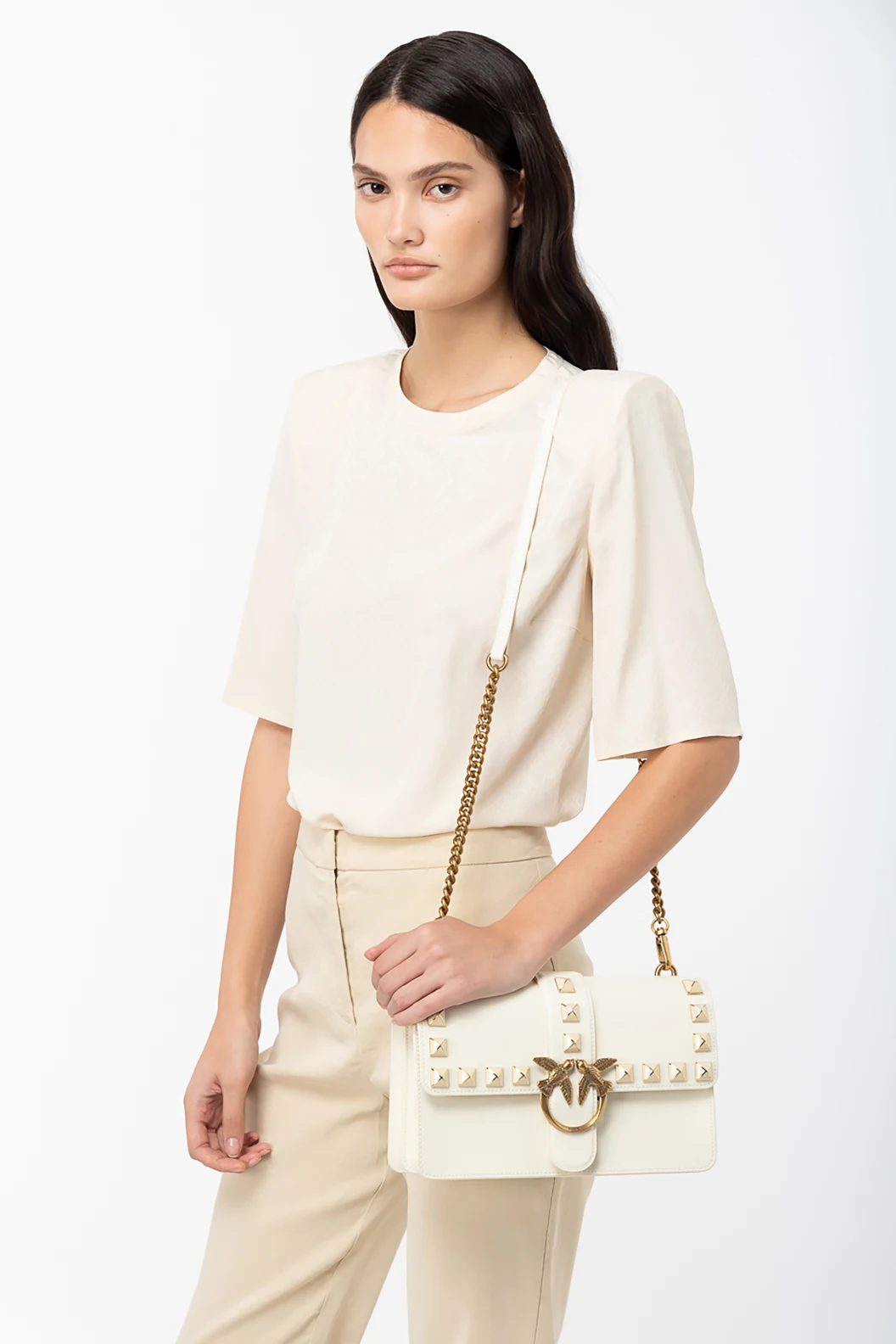 Белая сумка из телячьей кожи с золотистой фурнитурой, табличкой с логотипом, заклепками, откидным верхом с магнитной застежкой, внутренним карманом на молнии, внутренним отделением для карт, разделенным отделением и съемным плечевым ремнем с цепочкой.