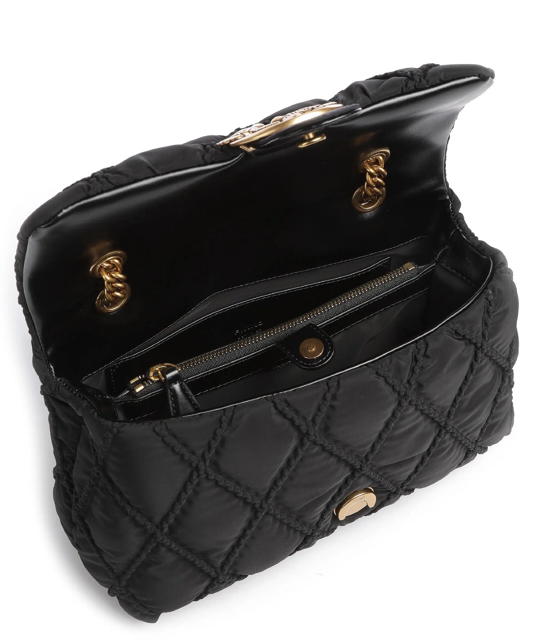 Сумка Pinko Classic Love Bag Puff Maxi Quilt Patch выполнена из переработанного нейлона со стеганым узором. Застежку украшает легендарная пряжка Love Birds. Дизайн завершает плечевой ремень из цепочки и наплечника из переработанного материала с эффектом кожи. Черная универсальная сумка Пинко подойдет для ежедневных прогулок.