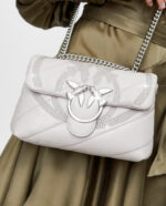 Сумка Classic Love Bag Puff из мягкой кожи наппа с крупной косой простежкой и металлическим декором. Застежка дополнена легендарной металлической пряжкой Love Birds с гальваническим покрытием «серебро». Внутри сумка обшита микрофиброй, разделена карманом-перегородкой на молнии и снабжена карманом на стенке. Плечевой ремень длиной 110 см представляет собой комбинацию классической металлической цепочки с круглыми звеньями и практичного наплечника из кожи наппа. Проверь подлинность своей Love Bag при помощи особого NFC-чипа.