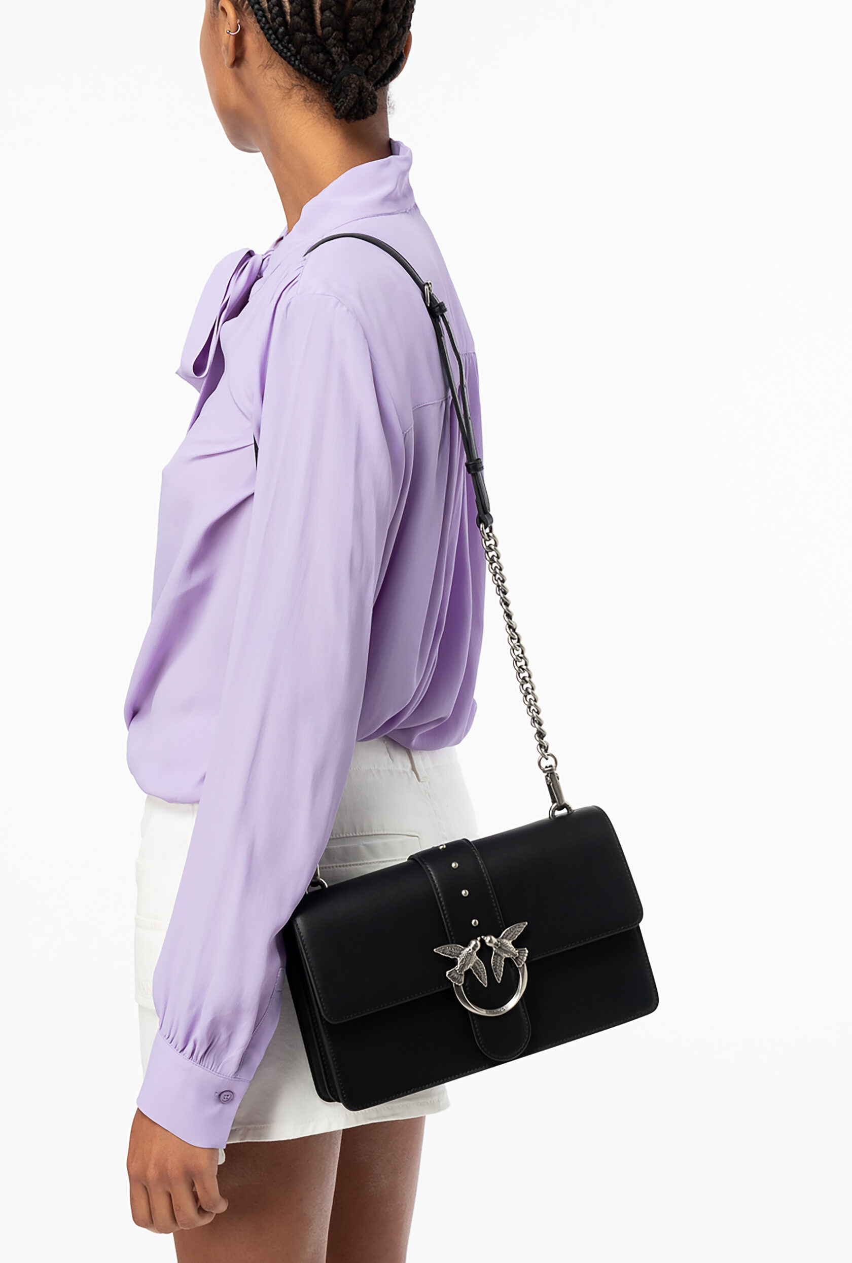 Сумка Love Bag из мягкой шелковистой кожи. Застежка с кожаным ремнем-обманкой и маленькими металлическими заклепками снабжена легендарной пряжкой из металла с ласточками Love Birds. Внутри сумка обшита подкладкой из микрофибры и снабжена карманом-перегородкой на молнии с пуллером, украшенным фирменным декором-заклепкой в виде ласточки, и кожаным карманом на стенке. Металлический ремешок-цепочка имеет длину 110 см. Проверьте подлинность своей Love Bag при помощи особого NFC-чипа.