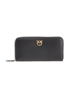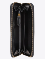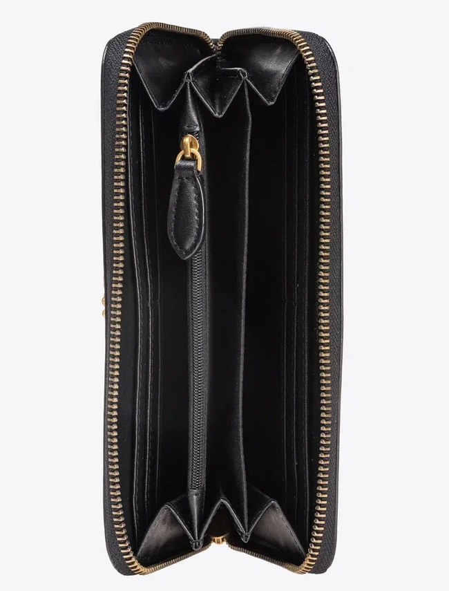 Кошелек с круговой молнией из кожи наппа с косой простежкой шеврон, украшенный металлическим фирменным знаком в виде влюбленных ласточек Love Birds с гальваническим покрытием «античное золото». Внутри кошелек обшит микрофиброй и разделен на четыре отделения, одно из них на молнии, а два других имеют кармашки для кредитных карт.