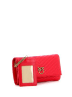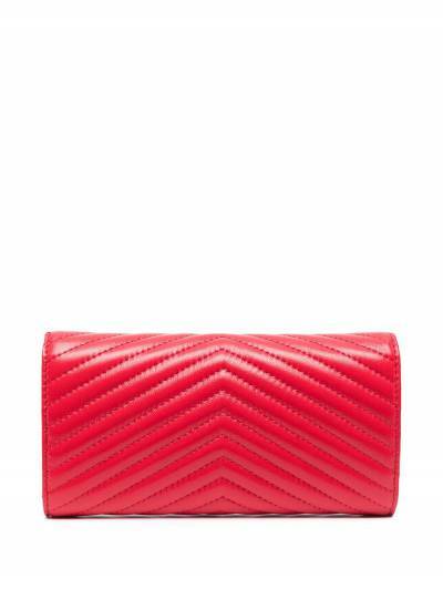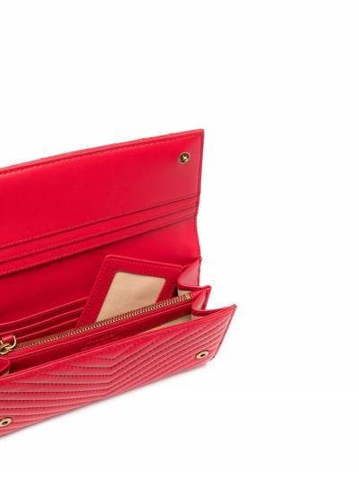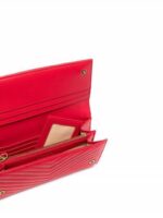 Кошелек с круговой молнией из кожи наппа с косой простежкой шеврон, украшенный металлическим фирменным знаком в виде влюбленных ласточек Love Birds с гальваническим покрытием «античное золото». Внутри кошелек обшит микрофиброй и разделен на четыре отделения, одно из них на молнии, а два других имеют кармашки для кредитных карт.