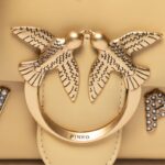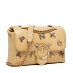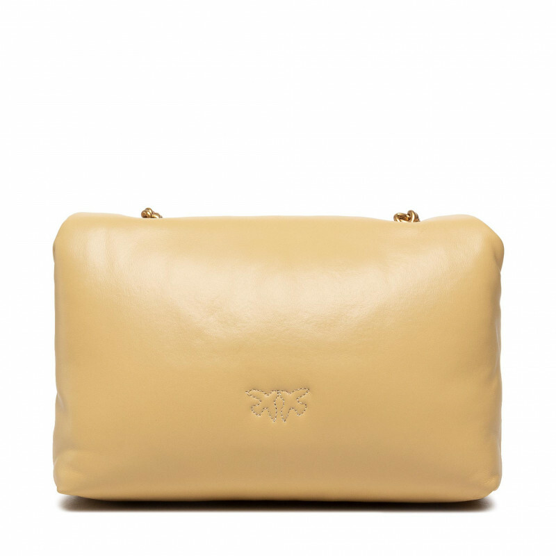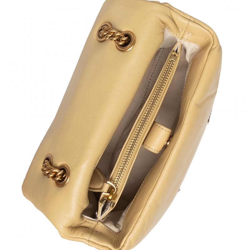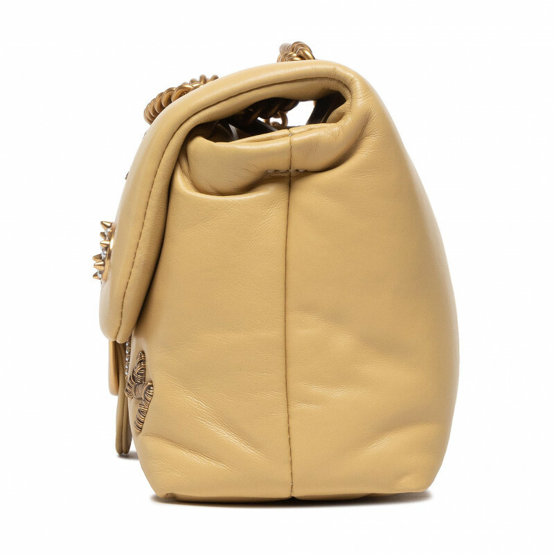 Сумка Mini Love Bag Puff из мягкой кожи наппа, украшенная металлическими значками-буквами, образующими надпись «Pinko Ti Amo». Застежка дополнена легендарной металлической пряжкой Love Birds с гальваническим покрытием «античное золото». Внутри сумка обшита микрофиброй, разделена карманом-перегородкой на молнии и снабжена карманом на стенке. Плечевой ремень длиной 110 см представляет собой комбинацию классической металлической цепочки с круглыми звеньями и практичного наплечника из кожи наппа.