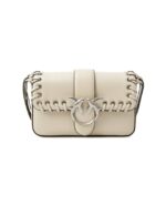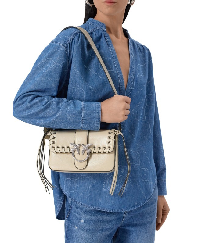 Сумка Pinko с декоративной шнуровкой и бахромой. Эти сумки от итальянского бренда Pinko выполнены из натуральной кожи и узнаваемы по фирменной металлической пряжке Love Birds (две птицы, образующие круг).